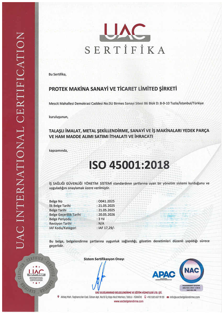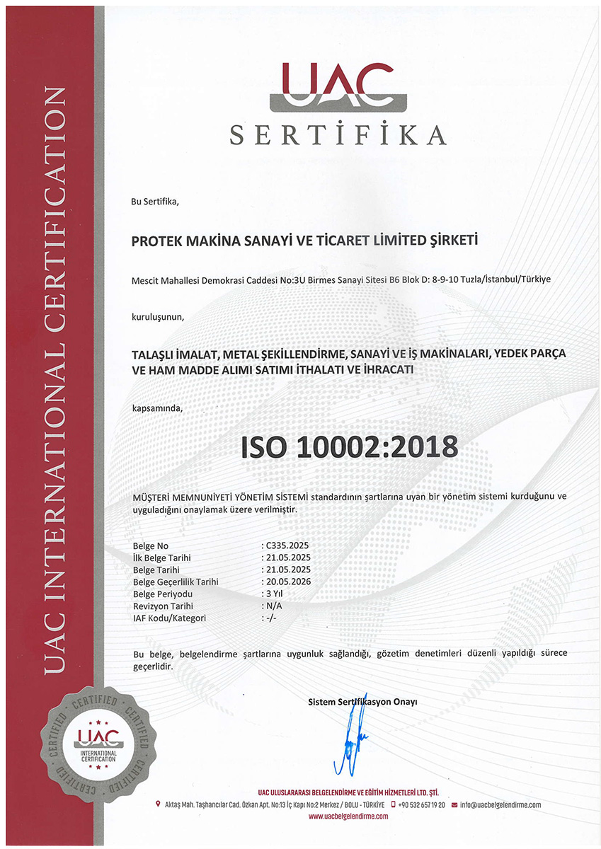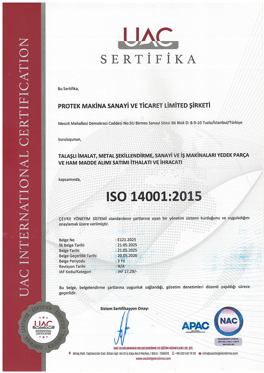 PROTEK MAKİNA San. ve Tic. Ltd. Şirketi üretim merkezinde, ISO 50001 Enerji Yönetim Sisteminin kurulumu ve işletilmesiyle, sürekli olarak enerji performansının iyileştirilmesi, maliyetlerin azaltılması, enerji verimliliğine yönelik yatırımlarının optimize edilmesi, çevresel ve sera gazı salınımının azaltılması ve doğal kaynakların korunmasını ana hedef olarak belirlemiş ve bu kapsamda aşağıdaki taahhütleri ilan etmiştir.
